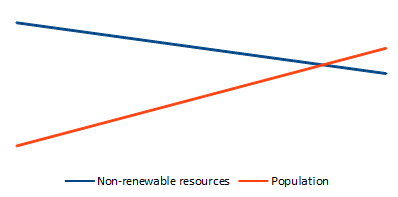 In words, the issue is about the increasing tension between the the size of the human population and the availability of non-renewable resources. Specifically, the population keeps growing, while the amount of non-renewable resources keeps diminishing. Note that the latter is a non-reversible trend, by definition.